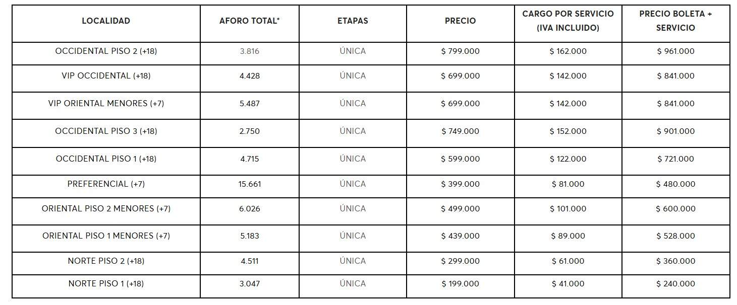 *Está incluido en el aforo total reservas técnicas, de organizador y de patrocinador que eventualmente pueden ser o no liberadas la venta. ** La disponibilidad de boletería en cada ETAPA dependerá de las reservas efectuadas en los canales de Ticketmaster en cada una de las fases de salidas a venta. Una vez agotada una etapa, por adquisición y/o reservas, se habilitará la siguiente etapa, por lo cual no se podrán vender entradas de etapas anteriores. Toda reserva de una etapa agotada, que no se haga efectiva posteriormente, ya sea por devolución, retracto de compra, no pago, entre otros, pasará a hacer parte del aforo (entradas disponibles) de la etapa que se encuentre actualmente disponible.