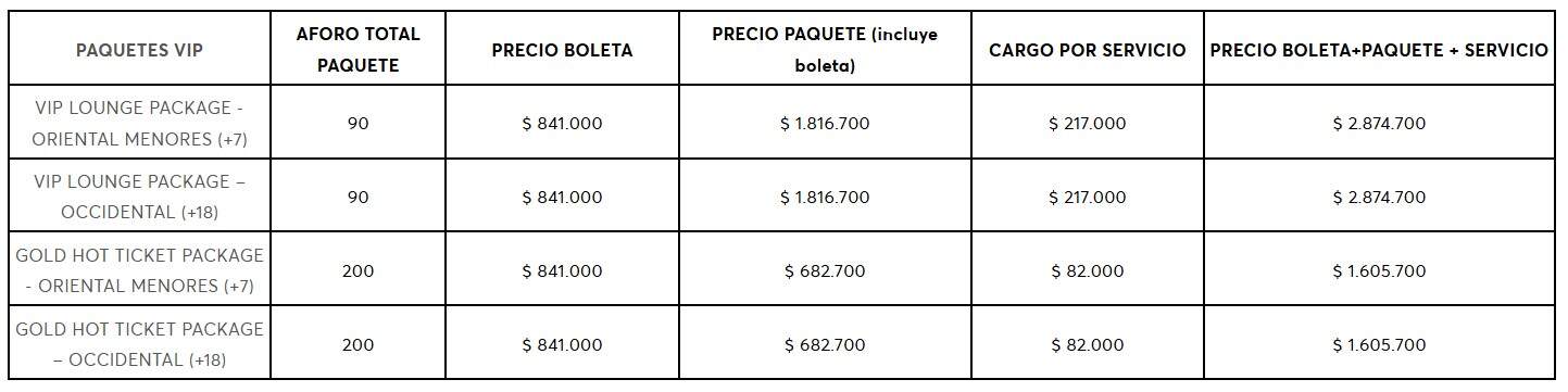 Los paquetes VIP NO incluyen participación por parte del artista. Estos paquetes NO incluyen boleta para una localidad exclusiva, incluye una boleta para la localidad VIP (Oriental Menores u Occidental)